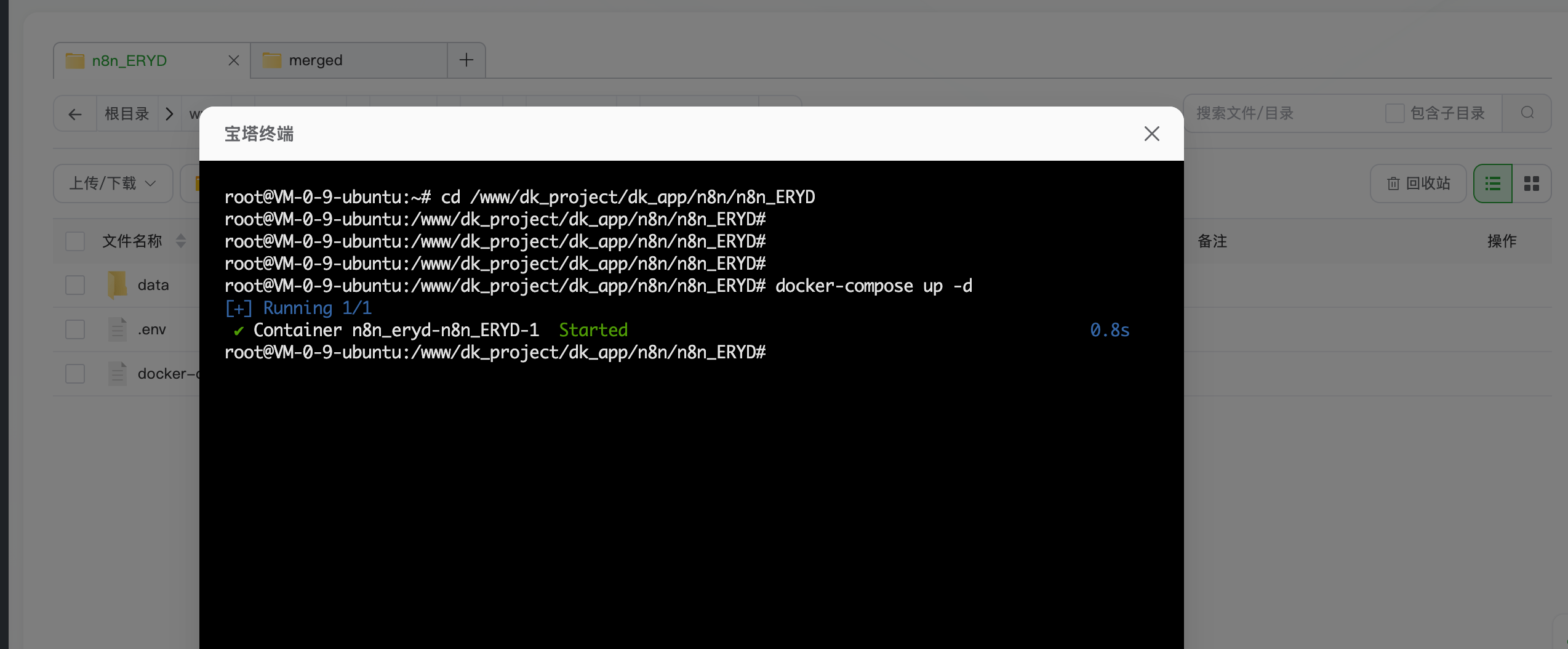 2.登陆服务器后台,找到n8n容器。找到自己的安装目录。