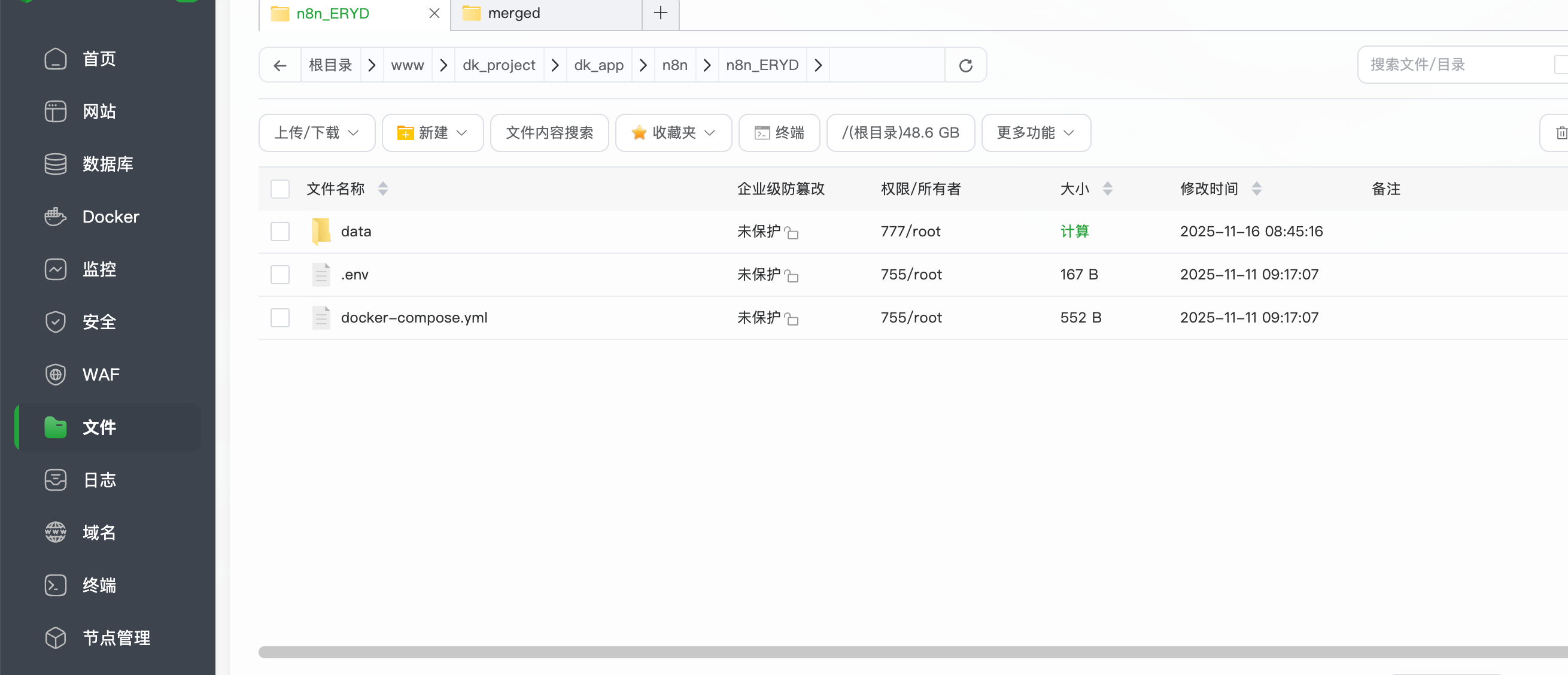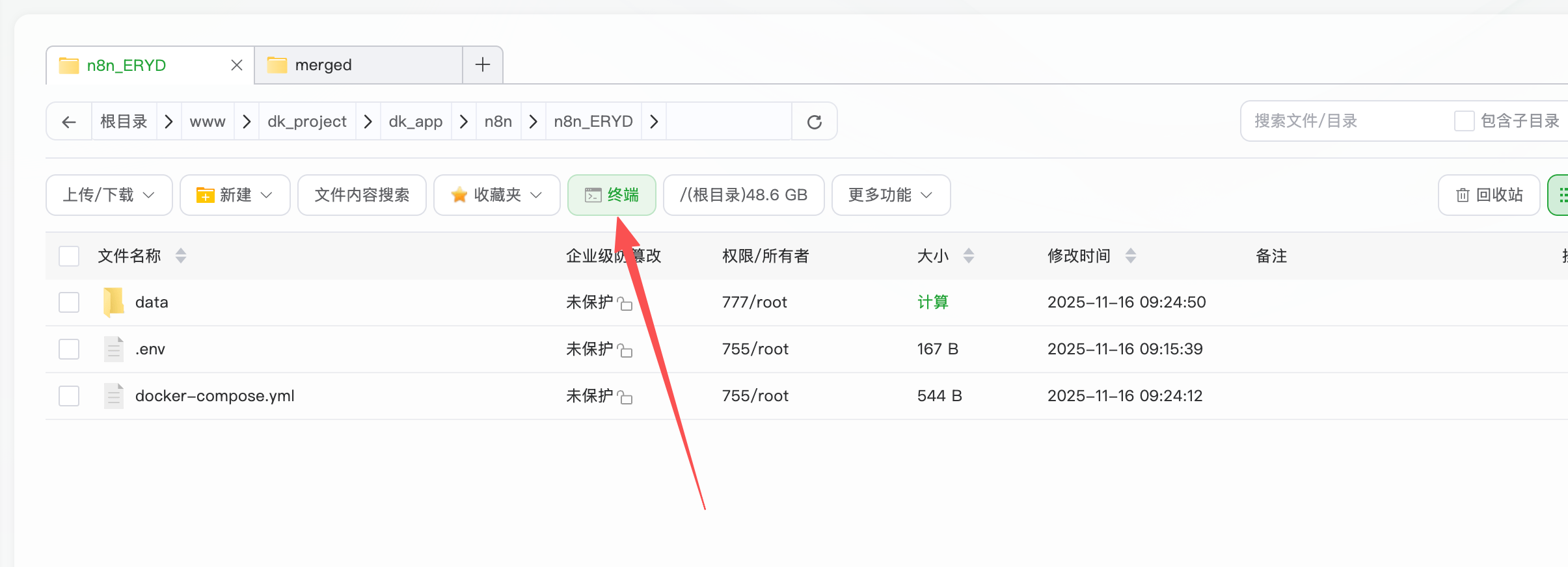 2.登陆服务器后台,找到n8n容器。找到自己的安装目录。