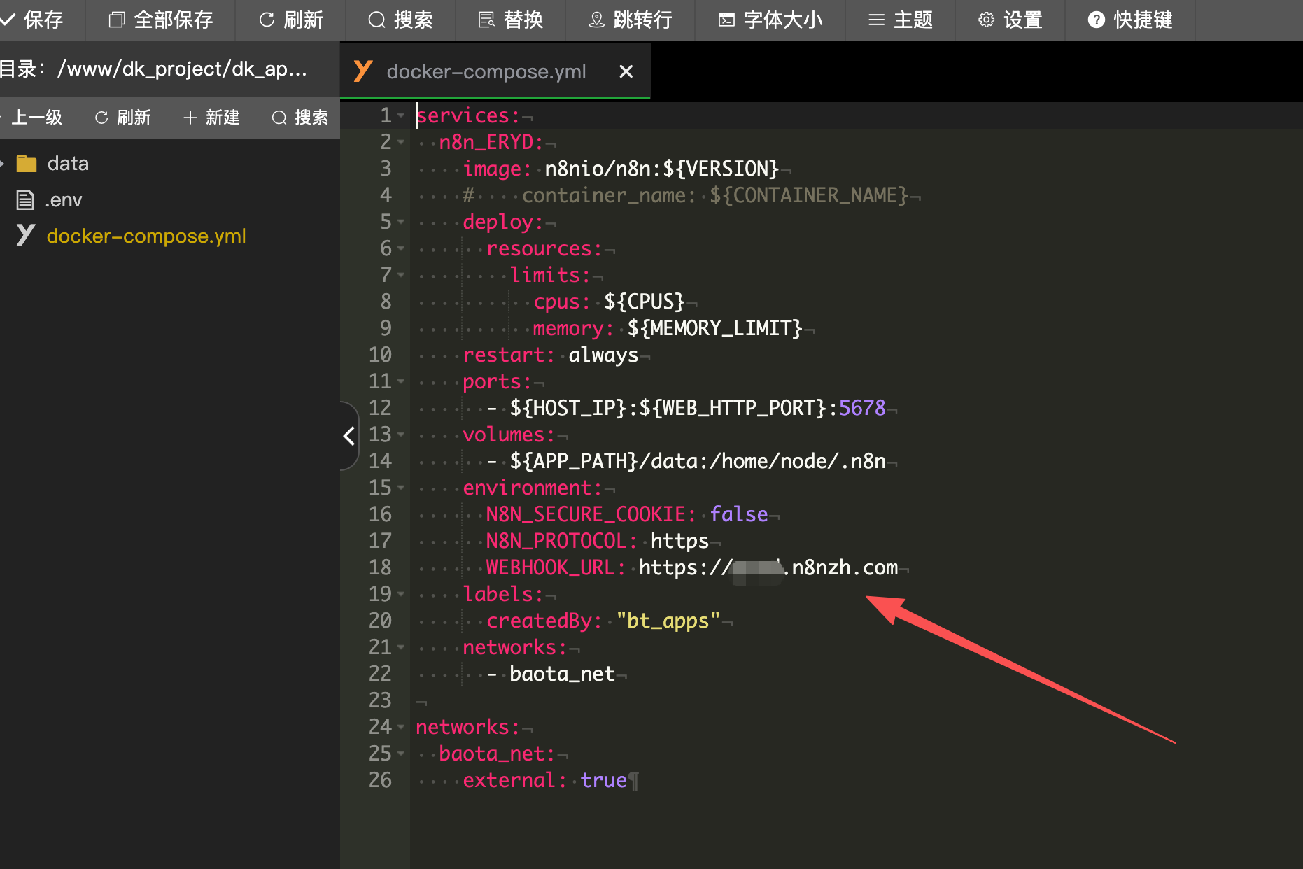 4.编辑docker-compose.yml文件。找到webhook_url。将localhost替换成我们的域名。